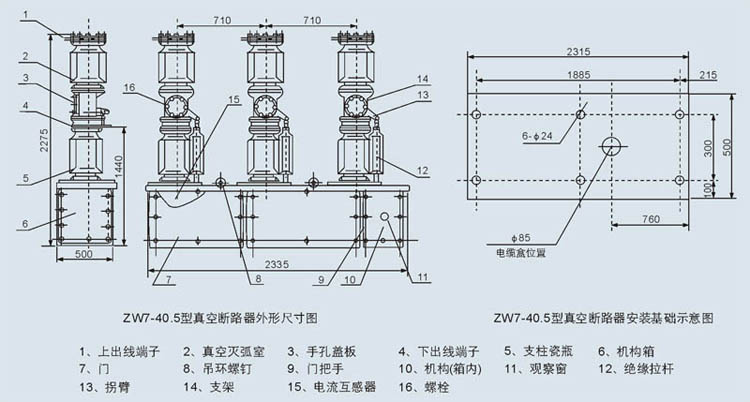 ??????ZW7-40.5型戶外高壓真空斷路器系三相交流50Hz,額定電壓為40.5KV的戶外高壓電器設備。附裝彈簧操動機構或電磁操動機構,可以遠控電動分、合閘,也可就地手動儲能,手動分、合閘。設計性能符合GB1984-89《交流高壓斷路器》國家標準的要求,并滿足IEC-56《高壓交流斷路器》國際電工委員會標準的要求。ZW7-40.5型真空斷路器,主要用于戶外35KV輸變電系統的控制與保護,也適用于城、鄉配電網絡及工礦企業的正常操作與短路保護之用。該產品總體結構為瓷瓶支柱式;上瓷瓶內裝真空滅弧室,下瓷瓶為支柱瓷瓶。適用于頻繁操作的場所。并具有密封性好、抗老化、耐高壓、不燃燒、無爆炸,使用壽命長、安裝維護方便等特點。